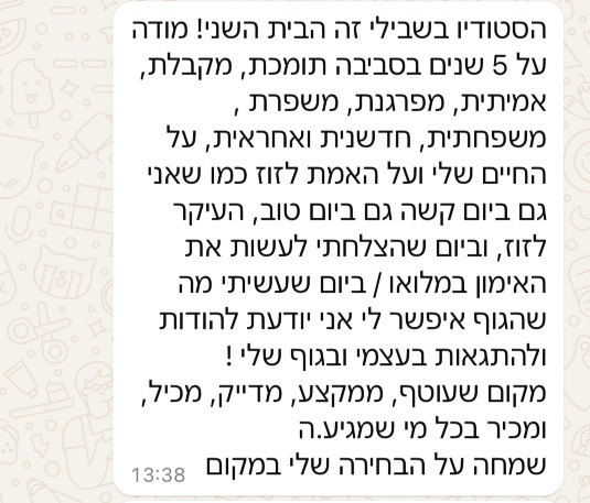 אני בן אדם שחוגג את החיים והסטודיו חוגג איתי, אז שתדעי נכנסת לסטודיו שכל כמה זמן קורה בו משהו- הרצאה/ אירוע/ סדנה/ ריטריט/ מסיבה..